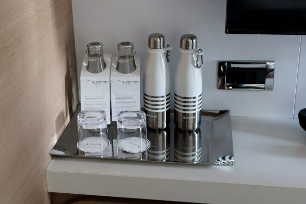 ポナンはゼロ・プラスティックを実践していてペットボトル入りの飲料は使っていません。各船室には水筒が設置されていて船内各所に給水機があります。