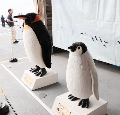 ヘリコプター格納庫内には南極の氷とペンギンの模型が展示されていました。氷は大陸産まれなので塩分はないとのこと。