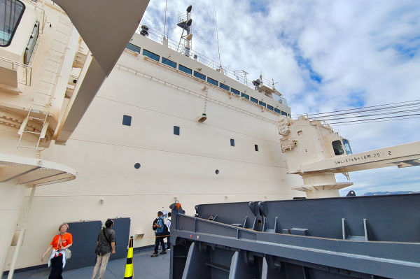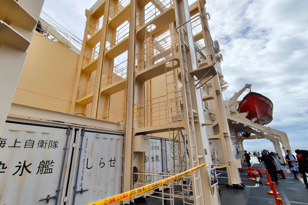 「しらせ」の船首には融雪用に散水するための放水口が沢山開けられています。乗艦待ちの人達に外観も説明してあげれば興味を持ってもらえると思うのですが。
