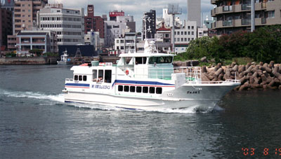 明石〜富島航路に就航したジェノバTに乗船しました。スピードを上げると船首があがり、まるで漁船のような走りっぷりです。明石海峡の本航路を横切る時には、時速約50km(GPSで測定)のスピードを出していました。