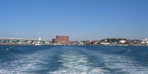 セントレア出港後、途中伊勢湾フェリーの乗り場を左に見て約10分の航海で常滑港に到着です。桟橋の先には常滑競艇場が見えます。