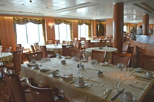 コスタビクトリアのビュッフェレストランはあまり広くはないので、朝食、昼食にメインダイニングを利用する人は多いです。 船内説明会でも、メインダイニングの利用を推奨していました。 朝食、昼食は自由席です。 レストランに入ると「日本人か?」「韓国人か?」と聞かれテーブルに案内されます。 1つのテーブルには同じ国の船客を固めている様です。 日本語のメニューを直ぐに持ってきてくれます。