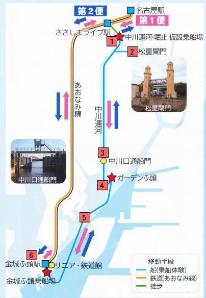 この乗船会は、笹島近くの中川運河・堀止仮設乗船場を出発し、名古屋ガーデンふ頭で船を乗り換えて、金城埠頭まで向います。 2隻の船の乗船料、リニア鉄道館の入場料、あおなみ線の運賃(名古屋〜笹島ライブ、金城ふ頭〜名古屋)が含まれて2,000円の参加料金です。