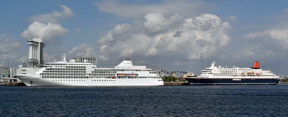 | シルバーシャドー(28,258総トン)(左) にっぽん丸(22,472総トン)(右) |