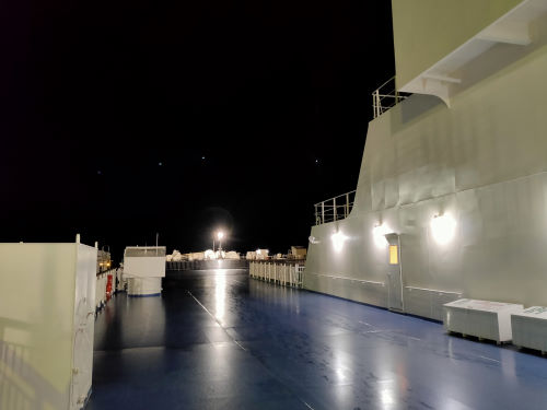 夜間はデッキに出られず、また私の船室は左舷側で岸壁の反対側なので出港風景は見られません。