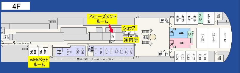 4Fにはツーリストルームとドライバー室があります。船尾にはwithペットのステートルームがあります。