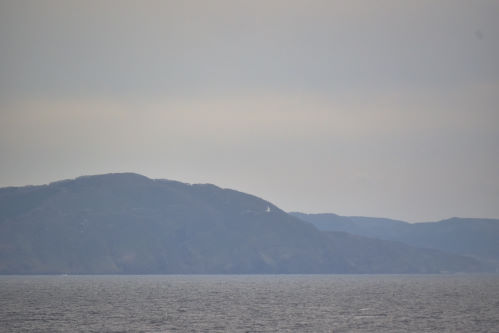 石川県と福井県の県境の沖合を航行中。雪を被った山は白山連峰?