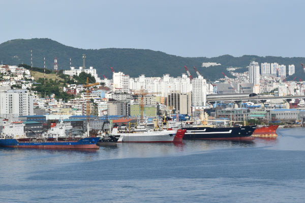 | 釜山港の真ん中にある影島 | 造船所で点検中?の船達 |