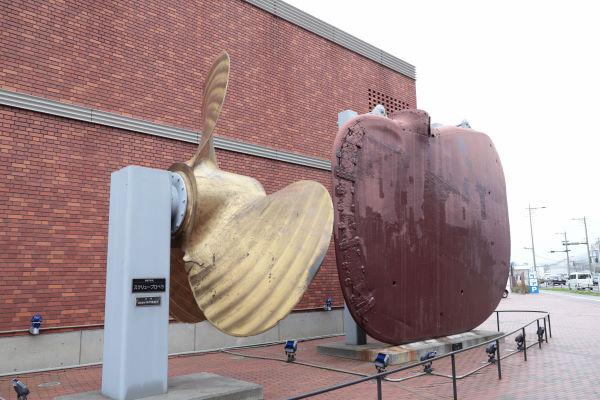 てつのくじら館前の大和波止場には戦艦大和の主錨が展示されています。手摺は戦艦大和の船首を模した様に配置されています。
