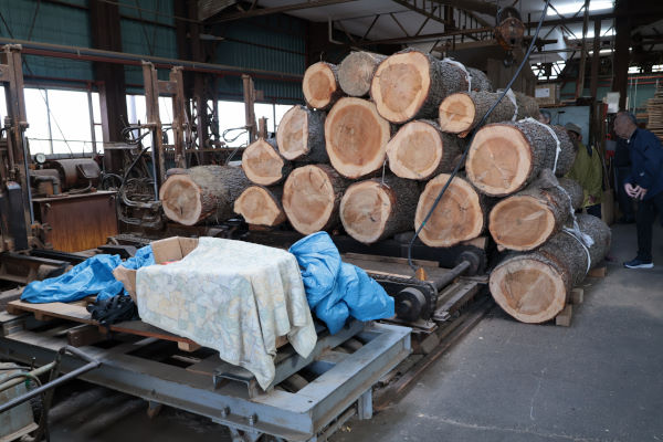 神戸市の森林保全活動に参加して神戸市内で伐採された原木をここで製材しています。原木として市内の街路樹が運び込まれることもあります。この時搬入していた原木は唐櫃台の市営住宅建設現場で伐採された原木とのこと。製材後の材木はテーブルや椅子などに加工され主に公共施設で使用されています。