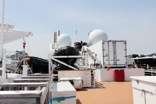 屋上には沖合に停泊する本船から上陸する時に使用するゾディアックボートが格納されています。本船の1階船尾にはゾディアックボートに乗り移るためのプラットフォームが常設されていて、安全に簡単に乗り移ることが可能です。