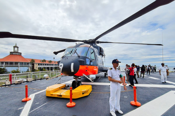 船尾の飛行甲板には物資輸送用のヘリコプターが展示されていました。格納庫には輸送用2機、観測用1機のヘリコプターを格納できます。