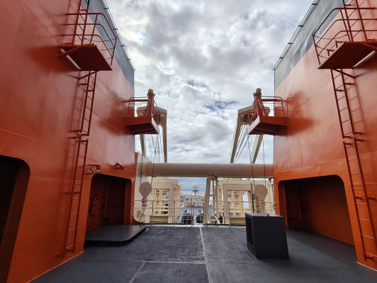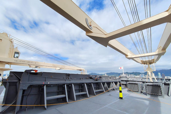| 船首のデッキクレーンと貨物倉 | 船首から艦橋を見上げる |
