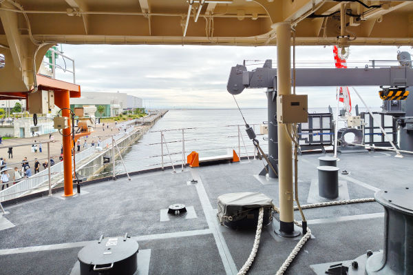 「しらせ」の船首には融雪用に散水するための放水口が沢山開けられています。乗艦待ちの人達に外観も説明してあげれば興味を持ってもらえると思うのですが。