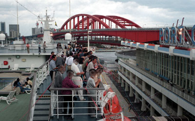 乗船客は402人で60才以上のリタイヤ組が多く見られました。主催が日通旅行名古屋支店であるため名古屋を中心とした東海地区の船客が半数以上を占めています。名古屋発の参加者に対しては名古屋〜神戸、敦賀〜名古屋の送迎バス(有料)が用意され、煩わしい乗り換えや電車の遅れを心配する必要がありませんでした。