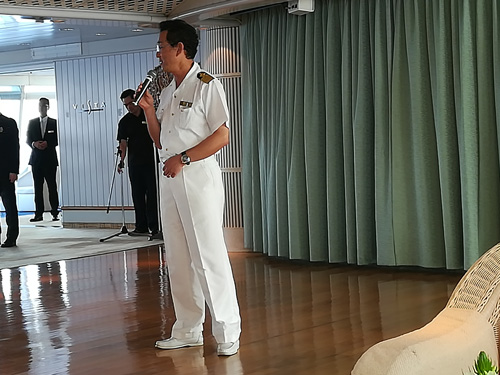 初乗船の方のためのパーティーがありました。最後に抽選会があり、当選すると今夜のディナーをシニアオフィサーと同席できます。見事、キャプテンテーブルに同席できることになりました。