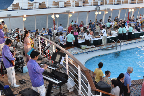 今夜の夕食は、プールサイドでデッキディナーです。テーマは「アジア」。
