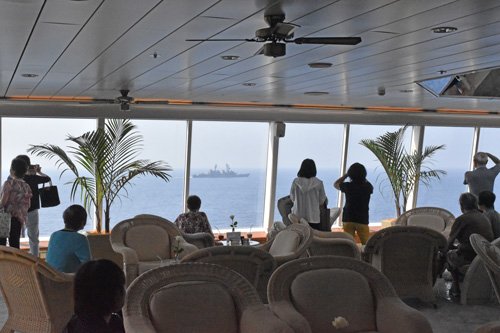 9時にランデブーポイントに集結し、海上自衛隊「せとぎり」の護衛を得て船団航行を始めました。貨物船3隻と船団を組んで航行の予定でしたが、2隻の貨物船は遅れてきて、夕方頃、飛鳥Ⅱを含め4隻が集合しました。