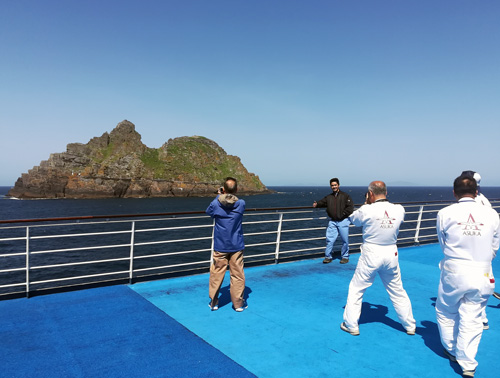 スケリッグ・マイケル島に接近しました。この島の山頂付近に世界遺産の修道院跡があります。588年にケルト人により建てられたとされています。