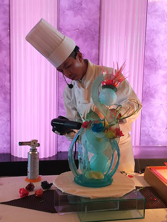飛鳥Ⅱのシェフパティシエ阿部竜馬さんが、飴細工の製作工程を見せてくれました。3時間30分に亘る大作です。