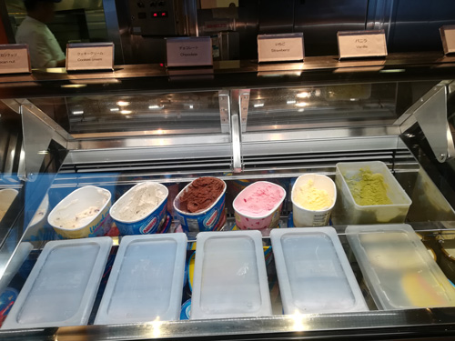 夕方、夕食前にアイスクリームを食べるのが日課になりました。サンディエゴでは冷凍庫にカバーが掛かっていましたが、今日は元に戻っています。アメリカの衛生検査は厳しいと聞くので、その対策だったかもしれません。この日は6種類のフレーバーです。他のフレーバーは製造メーカーのパッケージに入っていますが、抹茶だけ容器が違います。ひょっとして抹茶は自家製?