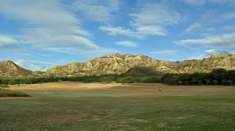 ダイヤモンドヘッドは火山の噴火口跡で、登山口は陥没したカルデラの底、日の出を見た場所は外縁の東側、頂上は外縁の西側に位置します。