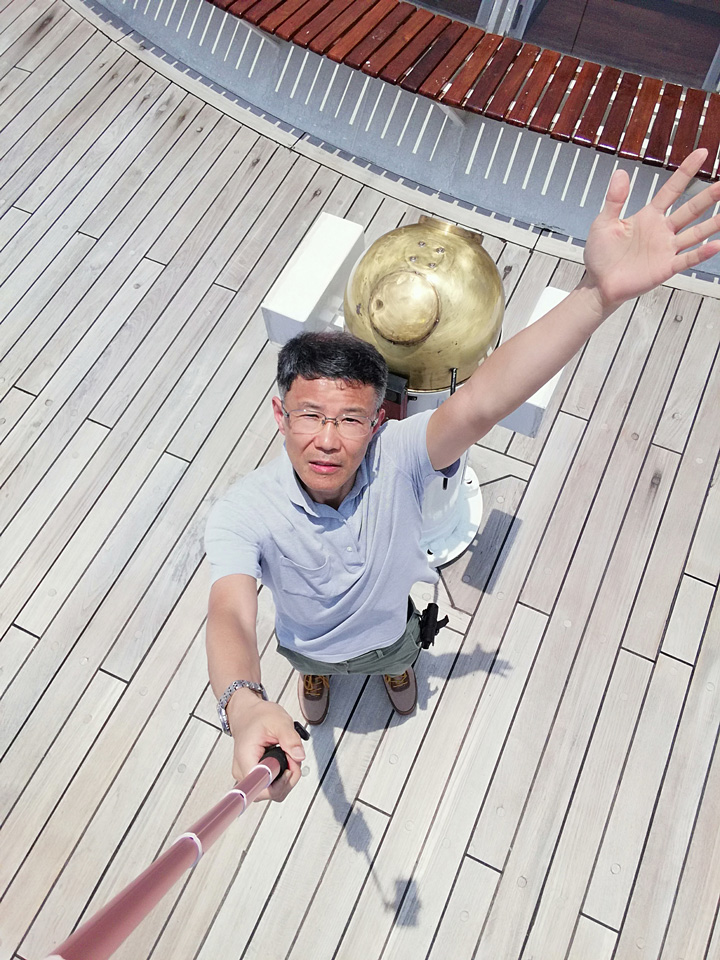 太陽が船の真上に来て影がなくなるタイミングで写しました。スマホと自撮り棒を使いビスタラウンジの前のデッキで撮影しました。事前にトライして構図を決めましたが、太陽を見上げるので、眩しくて表情が作れないし、画面が良く見えないのでフレームに納まっているのかどうか分からない状況でした。何枚か写して日陰に行って写真を確認し、また何枚か写して日陰で確認してを繰り返しました。